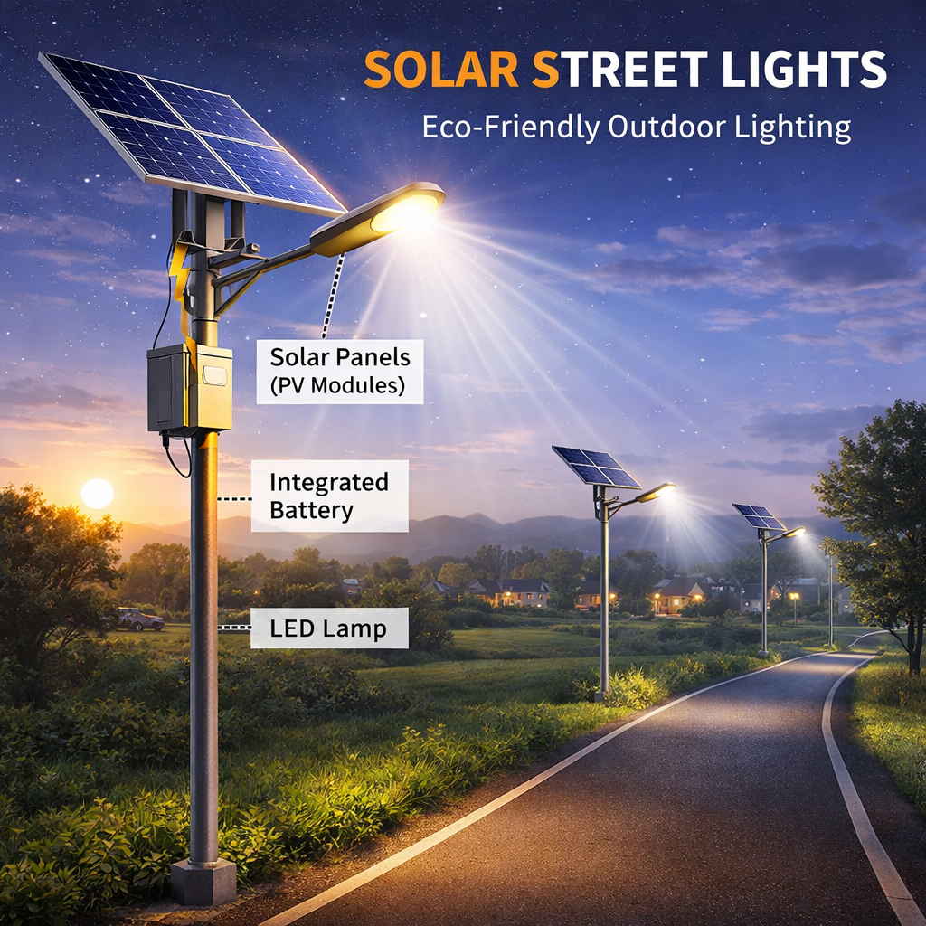 Solar street lights are raised light sources which are powered by solar panels generally mounted on the lighting structure or integrated into the pole itself. The solar panels charge a rechargeable battery, which powers a fluorescent or LED lamp during the night.