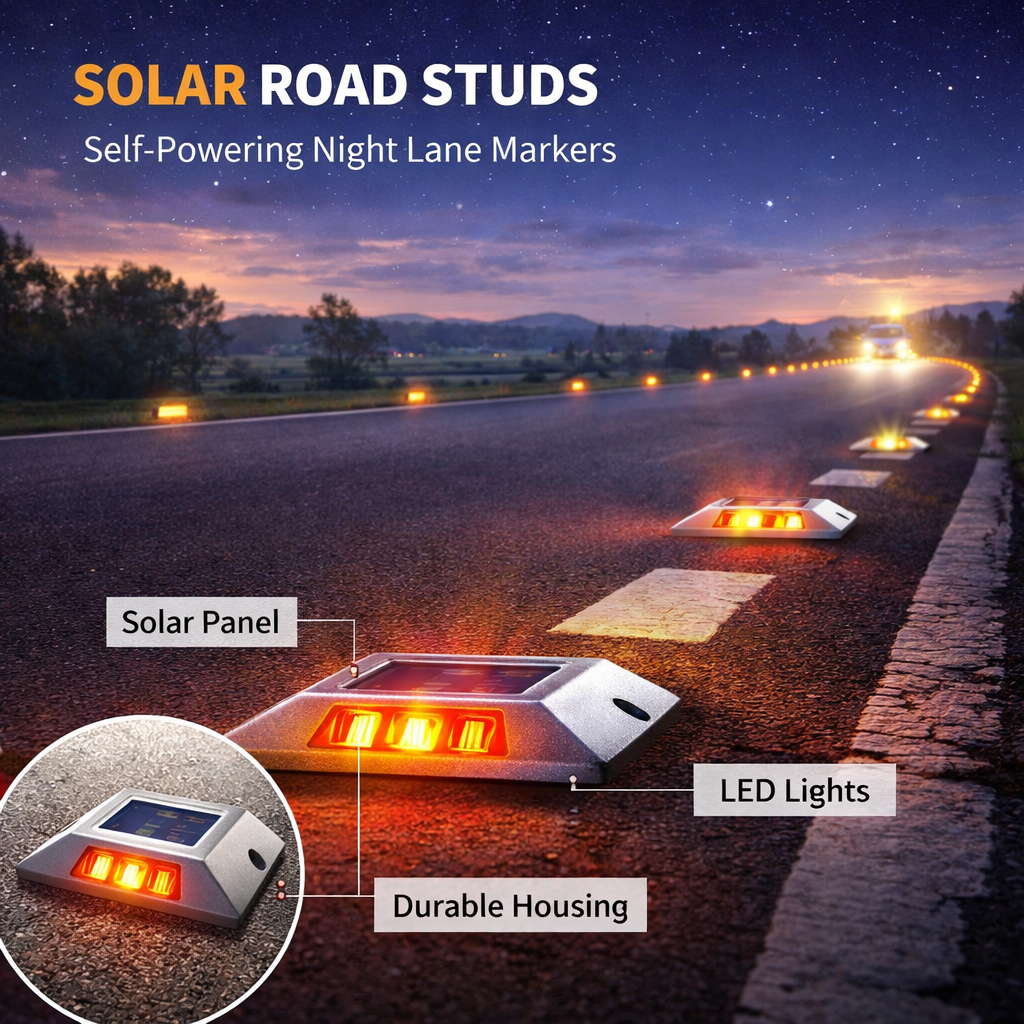 Solar road studs are durable, solar-powered LED markers used for lane delineation, enhancing road safety by providing high visibility (800m–1200m) in fog, rain, and darkness. They automatically charge during the day, reducing reliance on headlights and offering 25-30 seconds of reaction time for drivers. These studs are commonly installed at dangerous curves, intersections, and road edges.