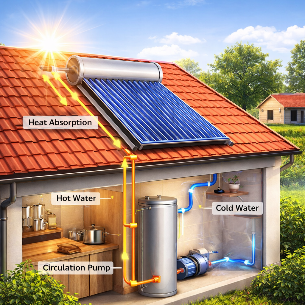 Solar water heating (SWH) systems use sunlight to provide cost-effective hot water, typically saving ~1500 units of electricity annually for a 100-liter domestic unit. These systems utilize rooftop collectors (flat-plate or evacuated tubes) to heat water, which is then stored in an insulated tank, with common capacities of 100-5000 liters for homes, Hospitals, Hotels etc.