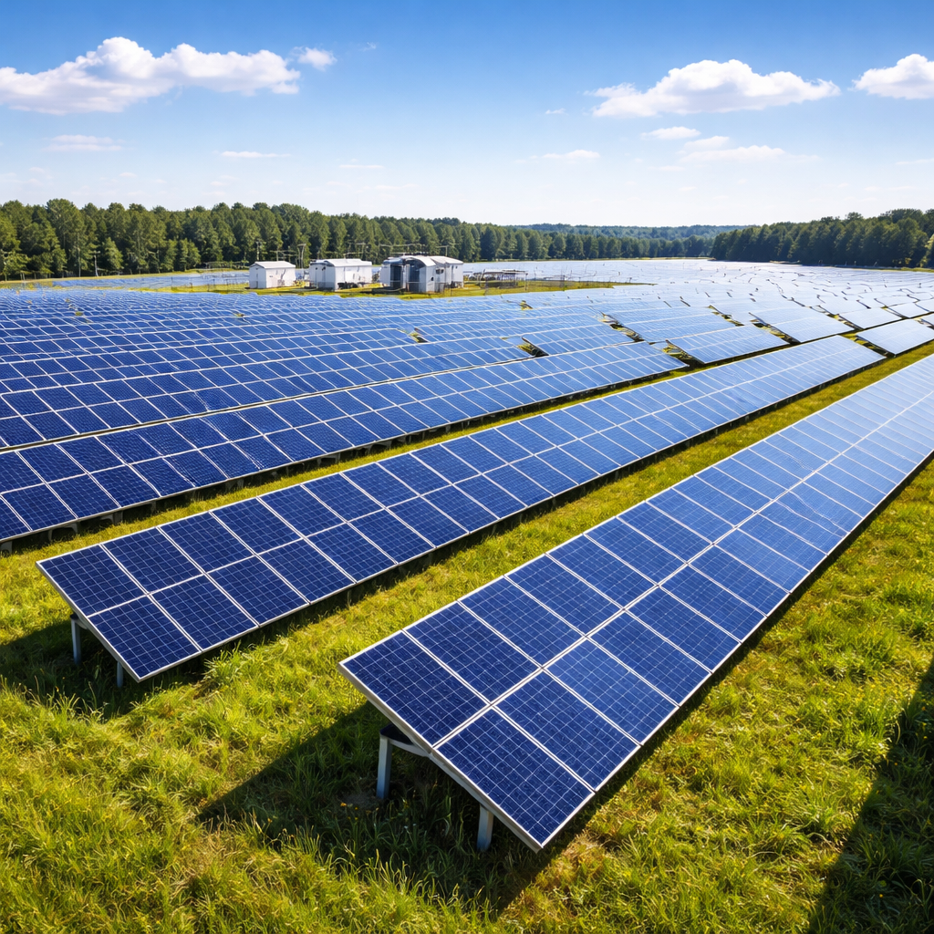 A large-scale installation where vast land areas are covered with ground-mounted photovoltaic (PV) panels that capture sunlight and convert it into electricity. The generated power is supplied to the grid, supporting sustainable energy demand while reducing dependence on fossil fuels and lowering carbon emissions. It improves grid reliability now.